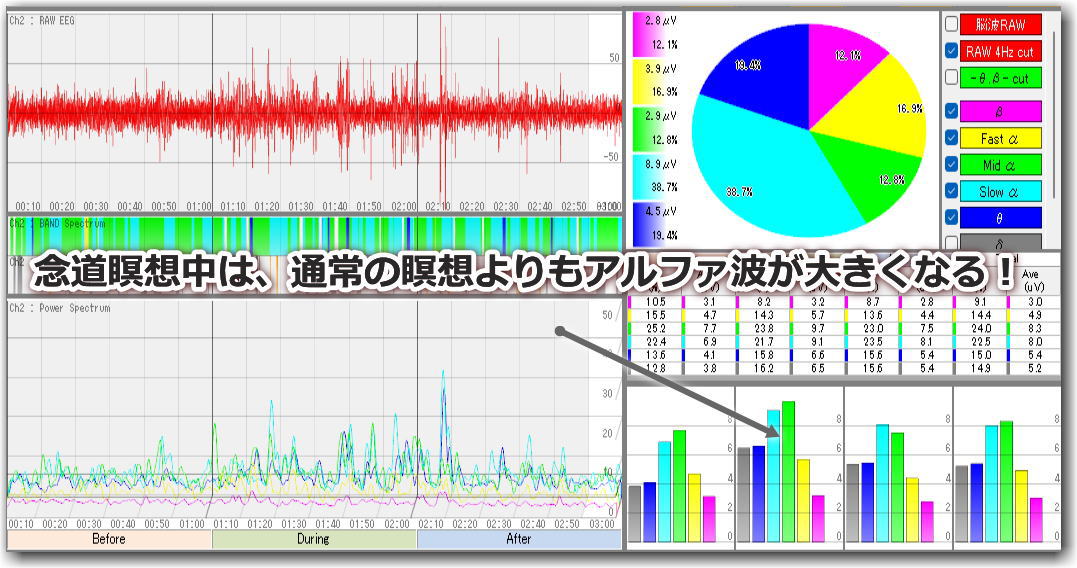 | 「念道瞑想」時の脳波を、脳科学・脳波研究で有名なエイアイ・ラボ・ジャパン様に計測してもらいました。 癒しのアルファ波が大きくなり、いらいらのベータ波などが下がっていることがよくわかります。 |